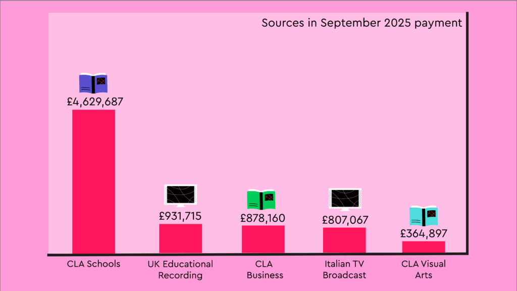 Where does the money come from? Licences for schools from the Copyright Licensing Agency (CLA) was our biggest source of money followed by UK Educational Recording, Business licences from the CLA, Italian TV broadcasts and Visual Arts CLA licences.