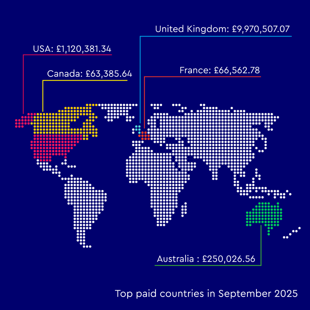 Which countries received the most in payments? After the UK (£9,970,507), the highest paid countries were USA (£1,120,381), Australia (£250,026), France (£66,562) and Canada (£63,385).