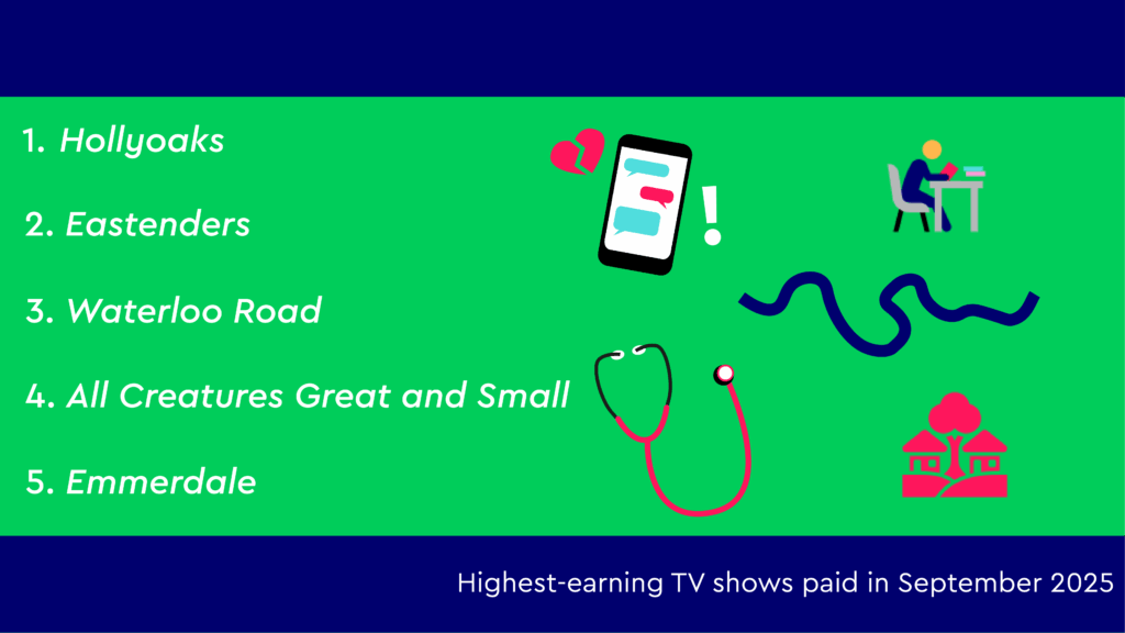 Which TV shows earned the most payments? Hollyoaks retained its position as the highest earning TV programme, followed by Eastenders, Waterloo Road, All Creatures Great and Small and Emmerdale.